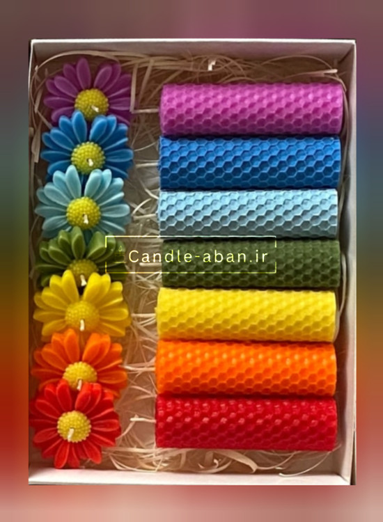 سایز: سایز شمع های موم عسلی 2×9 و شمع بابونه قطر 5 سانتیمتر
