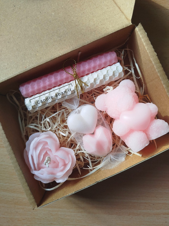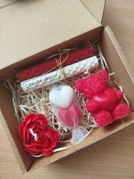 شامل یک عدد خرس قلب دار 6 سانتیمتر و یک عدد رز قلبی شکل 5 سانتیمتر، دو عدد قلب 2 سانتیمتر و 2 عدد شمع قلمی موم عسلی 9 در 1سانتیمتر
