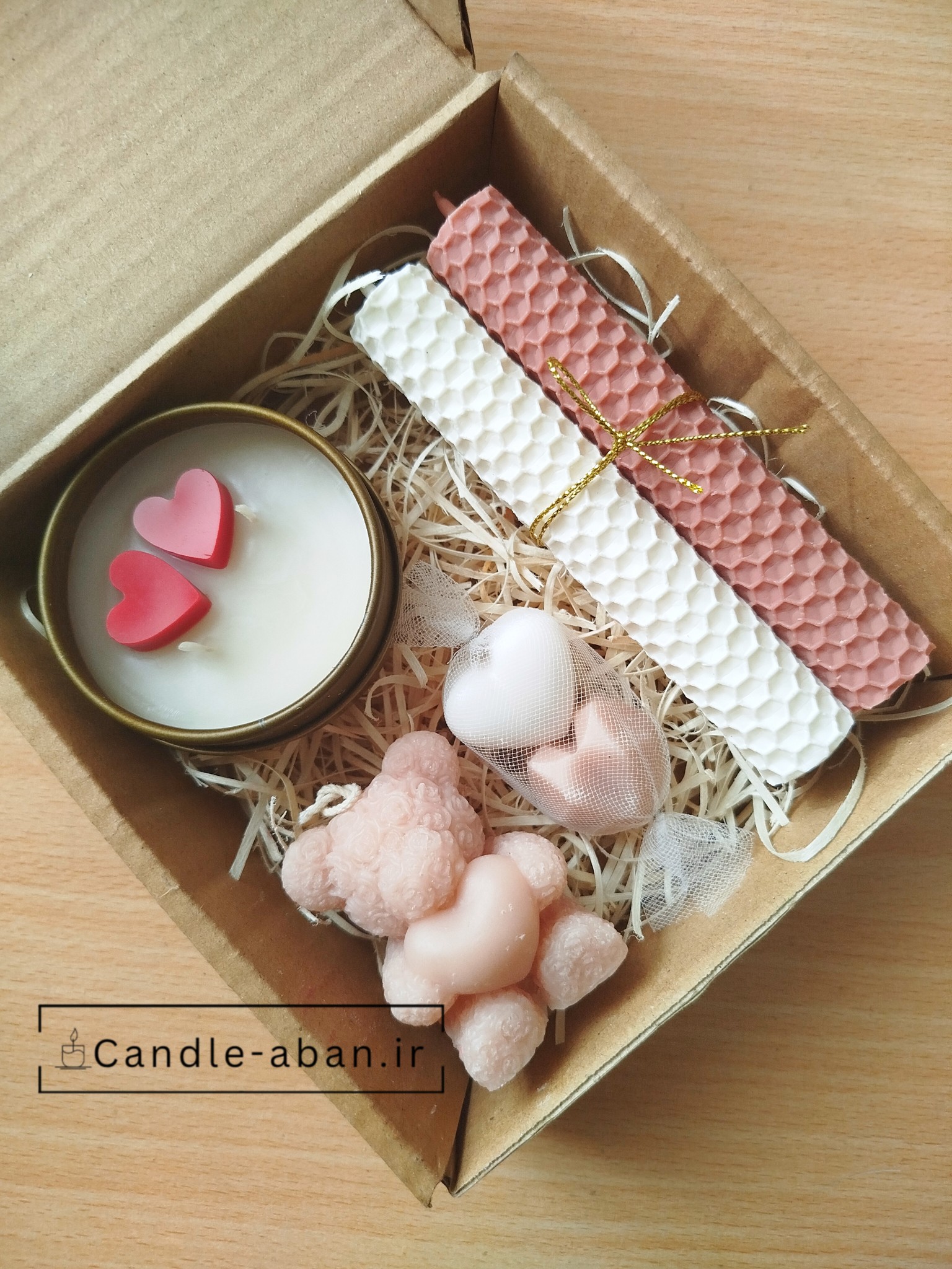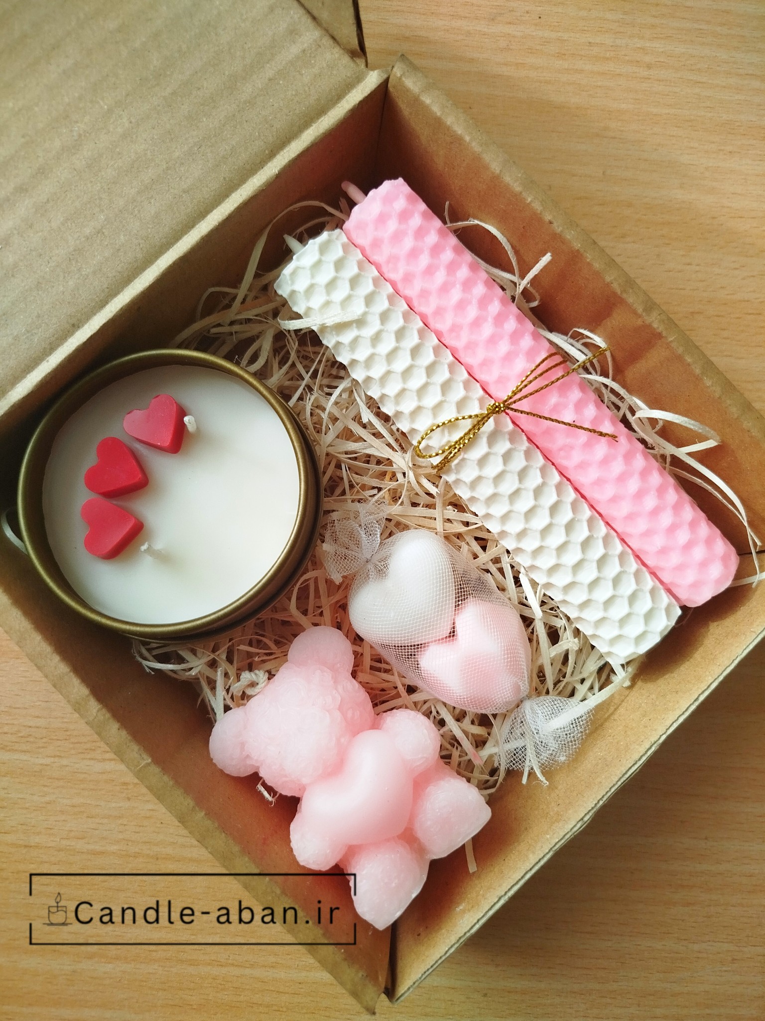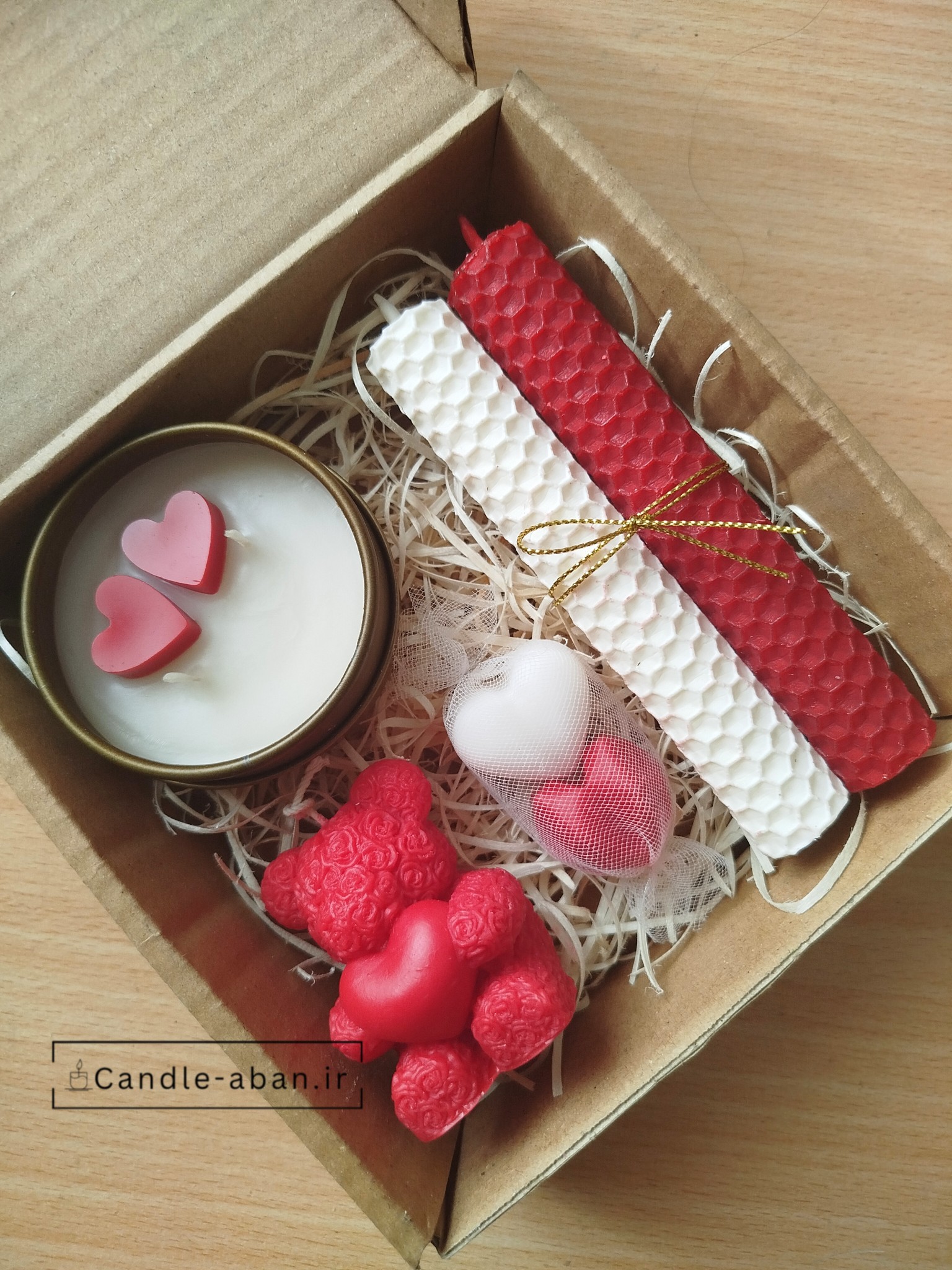 شامل یک عدد خرس قلب دار 6 سانتیمتر ، یک عدد شمع قوطی درب دار معطر نارگیل، دو عدد قلب 2 سانتیمتر و 2 عدد شمع قلمی موم عسلی 12 در 2سانتیمتر